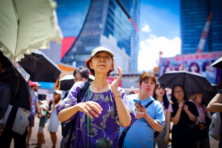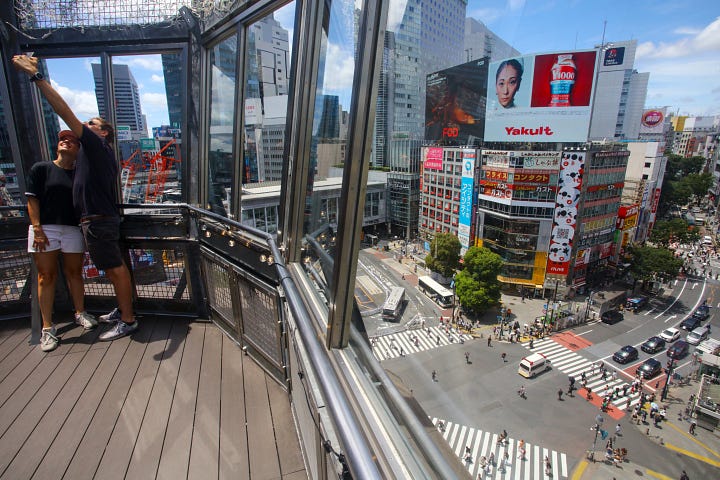 The next morning, our whole group waits sweating in the shade of the only tree at the Shibuya crossing. It’s already 9 a.m. and the day is scorching, the heat unforgiving. Shibuya is one of Tokyo’s largest commercial districts and the pedestrian crossing outside of the train station was made famous by Lost in Translation and has featured in other iconic films like … Sonic the Hedgehog 3. As many as 3,000 people cross the intersection in a single green light, and when it’s raining and nighttime and all those people have transparent plastic umbrellas that bounce up and down as they cross the street, the scene is nothing short of magical. This morning, with the morning rush hour over and the temperature in the high 30s Celcius, Shibuya is unusually quiet. A few campaigners for the upcoming election shout half-hearted appeals to the few passersby, but otherwise the area was sleepy and overheated.