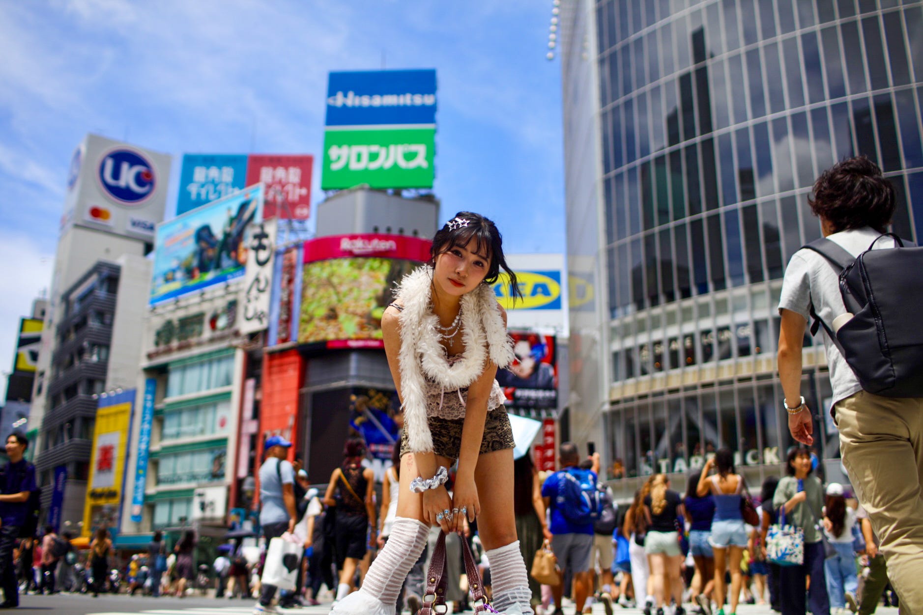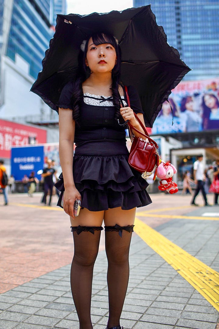 Even on a quiet morning the crossing is pleasantly chaotic, with people going in all directions from the five streets that meet here. The crossing itself only takes about a minute, and then there’s three or four minutes when everyone lines up for the next light to change. The photographers can be seen on all sides of the crossing, stalking behind an interesting person, readying themselves for the next rush into the street. I enjoy this so much: wandering around in the heat, camera hanging from one hand, looking for someone with a unique outfit, a particular way of standing, a spectacular hat, anything. I’m spoiled for choice, here, with cosplay teens and hungover salary men and hunchbacked women carrying heavy shopping bags, and what’s more is I love this style of shooting. I take most of my pictures underhand, knowing what the lens is seeing from years of taking sneaky portraits. I love the angle and depth of the 35mm lens hanging just below my hip, the sense of movement it creates. It’s how I’ve been taking photos for nearly 20 years, and I’m comfortable with and good at it.