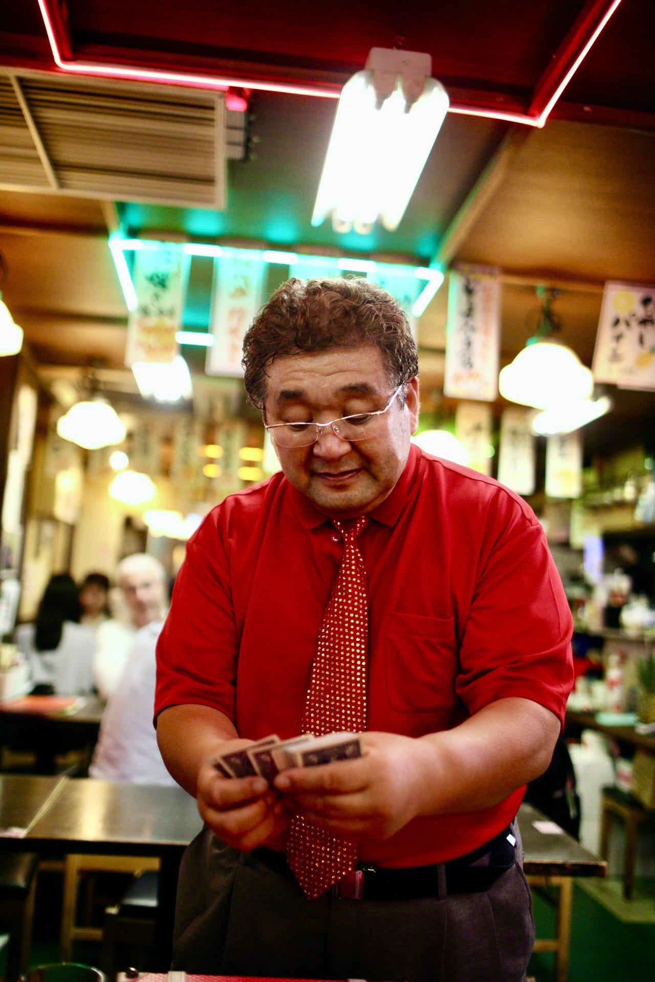 In this relaxed and encouraged state, I get my first good photo of the trip. A strange man with a floppy briefcase approaches our table, wearing a red shirt and a red spotted tie. His shirt is bulging at the seams and struggling to remain tucked into this belt. He has a kind of curled short perm. This is all quite unusual for Tokyo, but he soon provided an explanation: he popped open his briefcase and took out a deck of cards. Of course. He’s a roaming magician. He hovers over our table for a few minutes, doing card tricks in Japanese/pantomime, and all the while I’m able to take sneaky shots with my 35mm lens. This is my wheelhouse. When he’s done Ana accidentally tips him $50, and soon after we are scolded by the restaurant staff for drinking some mezcal she has brought with her and is pouring generously into our water cups. Before long, we head our separate ways into the steaming night. It’s not too late, and we have an early start the next day at the busiest intersection in the world.